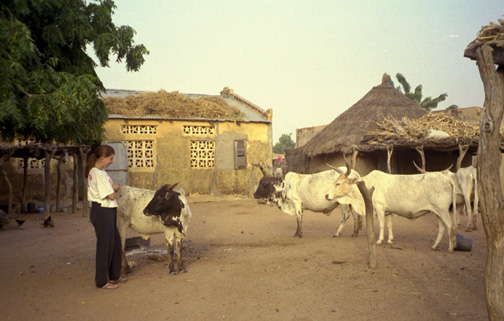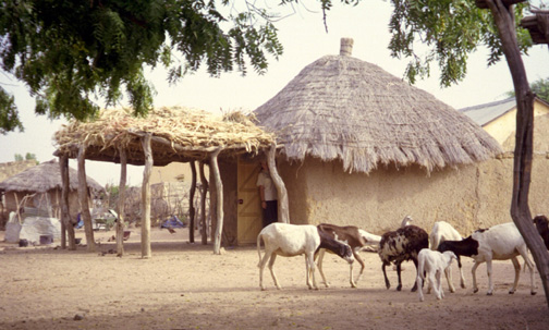 | There aren't too many exotic animals in the area of Senegal where Shannon lives, although sometimes monkeys or camels are seen by the road. But there are plenty of animals around the compound, the same ones we find at home -- sheep, goats, chickens, cattle, and an occasional donkey. In the photo below Shannon is peeking out of her hut, looking at a group of sheep. (Okay -- maybe she's looking at the camera.) The Senegalese sheep don't have a wooly coat, so they look a lot like goats. |
