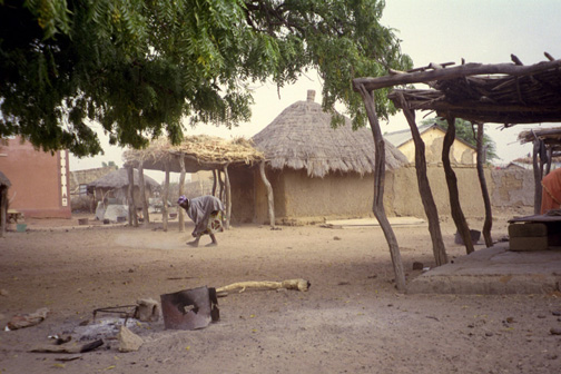 The Pulaar word for "compound" is the same as "family" because a compound consists of members of an extended family who live in a number of huts and buildings located around a central area where cooking and socializing takes place. In Shannon's compound the family consisted of three elderly brothers and their four wives and numerous children and grandchildren until all three of the brothers died in recent years. The Village Chief, Amadou Daff, died in late 1999, right before Shannon arrived in the village. The center of many compounds has a large Neem Tree like this one at the top of the photo below. It provides welcome shade in this hot desert area where temperatures are over 130 for several months a year. The woman in the photo that is sweeping the sand is Rekki, the Chief's wife (also his first cousin). The children play in this central area of the compound, and people walk, sit, and cook here all the time, but there are also animals around the compound all the time, so it is swept daily. Meals are cooked over a fire, and at the bottom of the photo you can see one of the four cooking areas in this compound that feed 20- 30 people. Shannon's village, Seno Palel, population 3000, is particularly large, so it has over 100 compounds much like this one. |