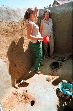 Everyone seems to be intrigued by Shannon's latrine, so here it is!  It is the small (6" diameter) hole in the bottom of the picture.  The hole leads down to a large tank in the ground via a curved pipe.  Shannon is holding the plastic liter cup used to "flush" by pouring water down the hole.
