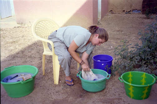 Shannon does laundry by hand.  Since she has to pull her own water from a well, she often goes to a fellow PC Volunteer's place because he has a faucet.  At Derek's place in Matam she fills three buckets with water, one wash and two rinse.  She either uses Fab laundry soap or the bar of peanut soap that you can see in the photo on the green tub on the left.  The peanut soap really is effective, especially on stains.