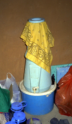 Using the spigot at the bottom, she puts her drinking water in plastic Nalgene bottles (from REI in America) that she carries with her almost all the time. Three of the bottles are sitting on the floor at the bottom of the photo.